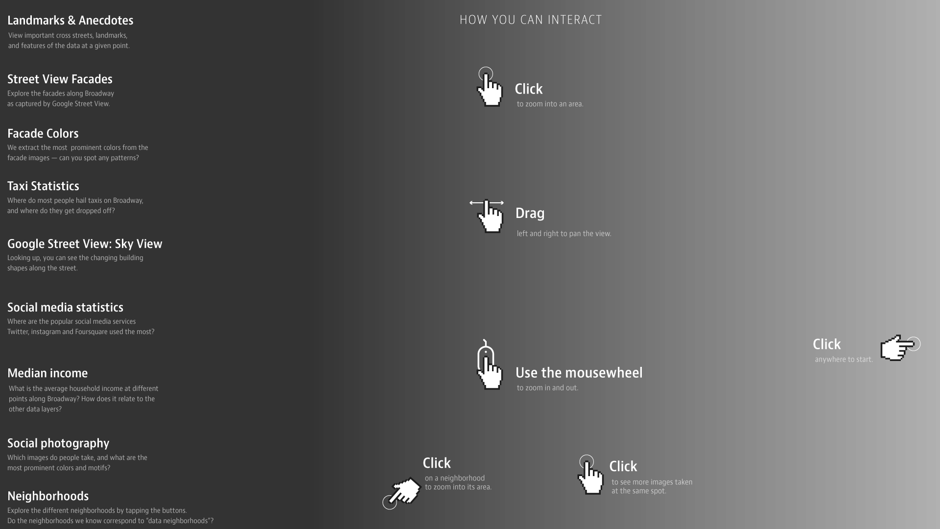 On Broadway is an interactive application originally designed for a full HD touch screen installation, run offline. Accordingly, please excuse us, if this application takes long to load, runs slow, or behaves not 100% as expected.